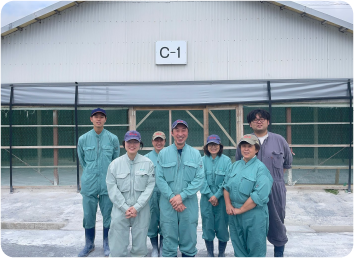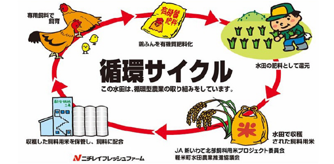 養鶏において、養鶏場の温度・湿度を徹底して管理、環境に配慮した飼育をしております。また地域との共生を念頭に農畜産循環型生産サイクルを目指し、農場内で『純和鶏®』の鶏ふんから作った有機肥料が近隣農家での飼料米生産に利用されています。『純和鶏®』はこの飼料米をはじめ、ハーブなどを配合したこだわりの飼料で時間をかけて育てられています。