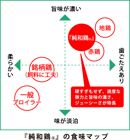 『純和鶏®』は、日本人が好む、素材そのものの味わいを追求しました。日本で一般的に食べられる若鶏の多くは、その原種が育種改良された欧米の調理法にあわせた、淡白な味わいでした。しかし『純和鶏®』は、日本人が好む適度な弾力を持った食感、噛むほどにジューシーでコクを感じる旨味の濃さなど、日本人がおいしいと実感できる味わいをどこまでも追求したまさに日本の鶏。おいしさにもニッポンにこだわった鶏なのです。