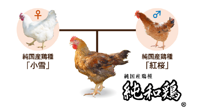 『純和鶏®』は、純国産鶏種「小雪」と「紅桜」を基礎鶏に、ニチレイフレッシュファームが養鶏した、純国産にこだわり抜いた鶏肉です。