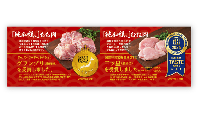 ジャパン・フード・セレクションにて『純和鶏®』もも肉がグランプリ受賞、International Taste Instituteにて『純和鶏®』むね肉が優秀味覚賞三ツ星受賞と各方面においてご評価頂いております。