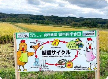 養鶏において、養鶏場の温度・湿度を徹底して管理、環境に配慮した飼育をしております。また地域との共生を念頭に農畜産循環型生産サイクルを目指し、農場内で『純和鶏®』の鶏ふんから作った有機肥料が近隣農家での飼料米生産に利用されています。『純和鶏®』はこの飼料米をはじめ、ハーブなどを配合したこだわりの飼料で時間をかけて育てられています。